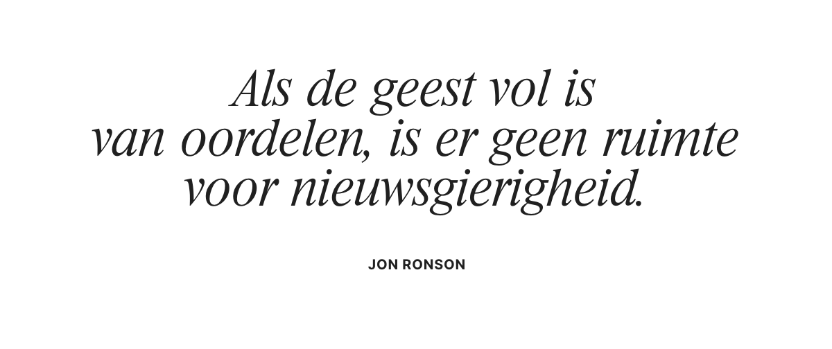 Het beetje inspiratie dat me aan het denken zette om over oordelen te schrijven, kreeg ik toen ik vorige week tijdens de rit naar school luisterde naar een interview met journalist en schrijver Jon Ronson. Hij zei: “Als de geest vol is van oordelen, is er geen ruimte voor nieuwsgierigheid." Het resoneerde bij mij als een reminder om open, flexibel en nieuwsgierig te blijven, in tegenstelling tot gesloten zijn en bij voorbaat overtuigd.